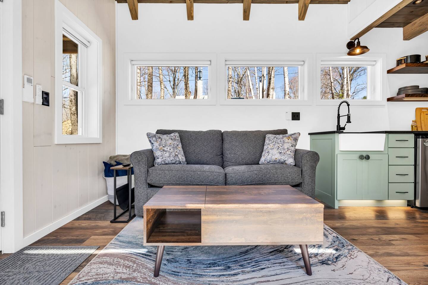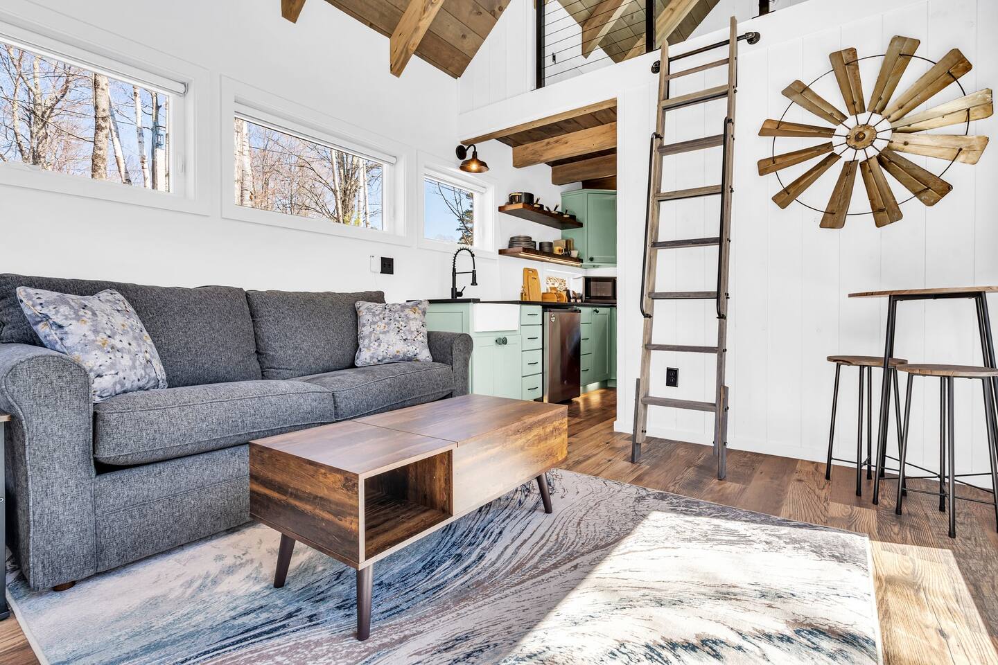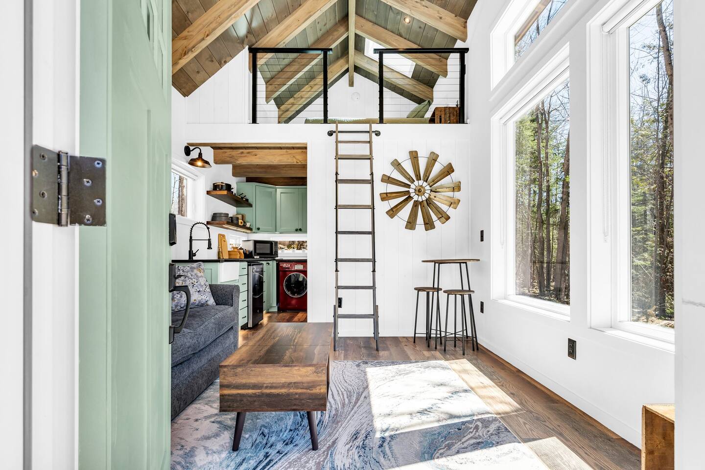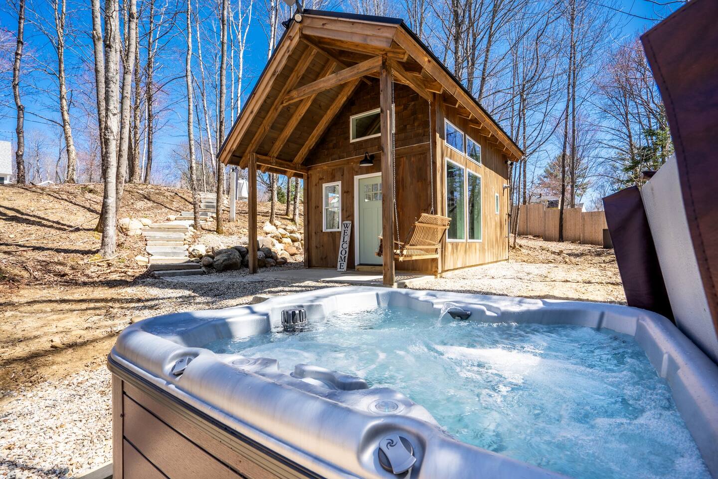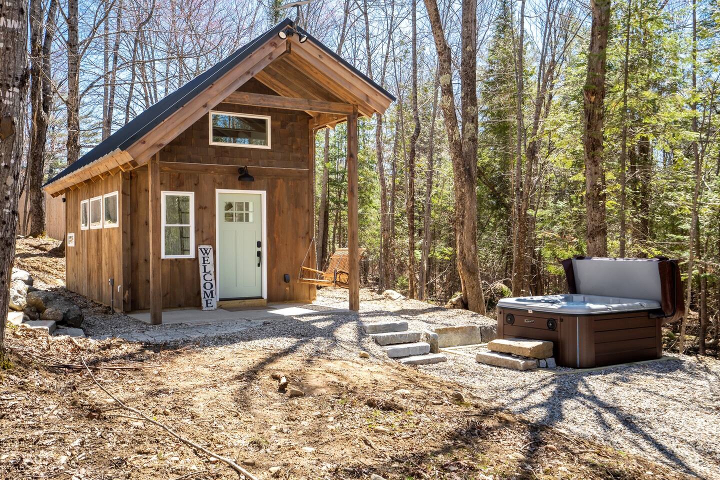 The space is perfectly designed to be small and cozy, but also have everything you need to both live and work comfortably. There is a loft with a queen-sized bed, as well as a pull-out couch in the living room area. *NOTE* This cabin was designed and built specifically for two people. There are two beds, so you are welcome to travel with four guests, but please note there is not a wall between the two beds (the loft is open to the living room), and the dining table only has two stools. *Tumbledown Mountain - 15 minutes *Mt. Blue State Park - 4 minutes *Farmington - 25 minutes *Rumford - 30 minutes *Sugarloaf Mountain - 1 hr *Saddleback Mountain - 45 minutes *Sunday River - 50 minutes KEY FEATURES: - hot tub - fully equipped kitchen - porch swing - large picture windows - fire pit - flat top Blackstone grill - outdoor twinkle lighting BEDROOM The loft area is accessed by a ladder that can be tucked away to create more space downstairs. On the night stand you will find a power station and sound machine. The queen bed sits below a skylight perfect for stargazing. BATHROOM The tiny home has just one full bathroom with all the conveniences of a full-size home. The locking pocket door provides privacy. Tile shower with glass door and shelves for your products. KITCHEN, DINING The small kitchen and 2-seater dining table offers all the conveniences of a full-size kitchen just shrunk down into a mini version to fit in the space perfectly. The kitchen will be fully stocked so you can cook all your own meals, and includes pots, pans, knives, utensils, and an array of different style coffee makers. The microwave-looking appliance is also an oven AND an air fryer. Some bad news…although the mini-fridge has a freezer it does NOT fit a pint of ice cream....plan your frozen desserts according! LIVING ROOM From the full-size couch, stream your favorite shows on the compact 32" HDTV. From this cozy spot, you feel like you are part of the forest that can be seen through the large picture windows. Floor-to-ceiling windows bring the stunning natural scenery indoors, fulfilling your longing to experience nature's beauty. OUTSIDE SPACE Step out onto the porch and hang out on the Amish build porch swing. Cook up all your favorite meals on the Blackstone flat top grill. Hop in the hot tub to rejuvenate your mind and body, you'll be surrounded by nature. Sit around the custom designed, welded fire pit while roasting marshmallows, reminiscing on old memories, and creating new ones. There is parking for 3 cars in the driveway. LOCATION While this area may feel like the middle of nowhere to most people, it is home to us. The tiny home is within 30 minutes of hospitals and groceries (Farmington & Rumford). And right in the middle of many outdoor activities. The location of the tiny home is right in historic downtown Weld. It sits just down the hill from the one road that passes through town and you may see and hear the few cars pass by while sitting around the fire.