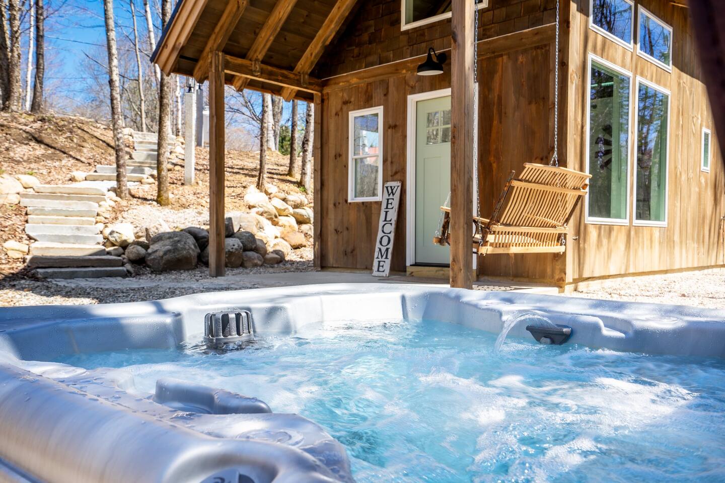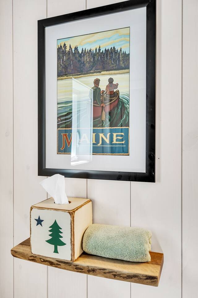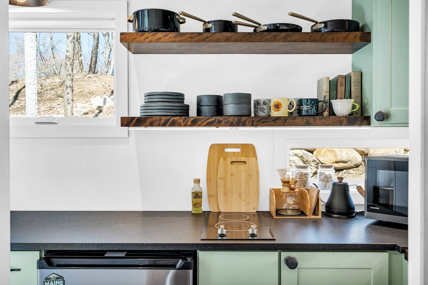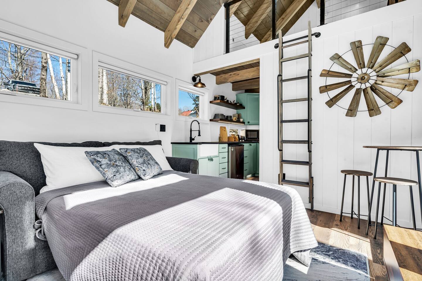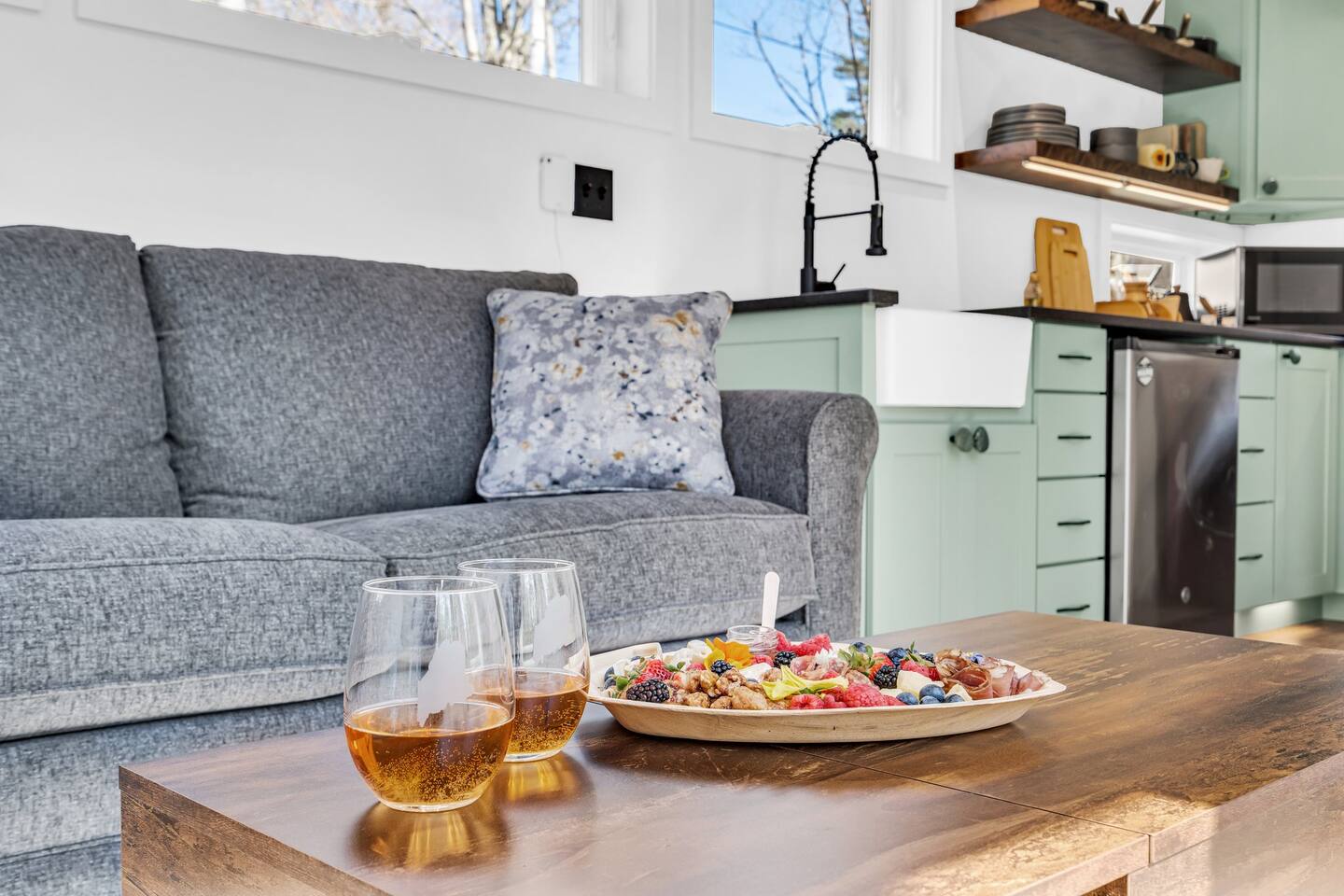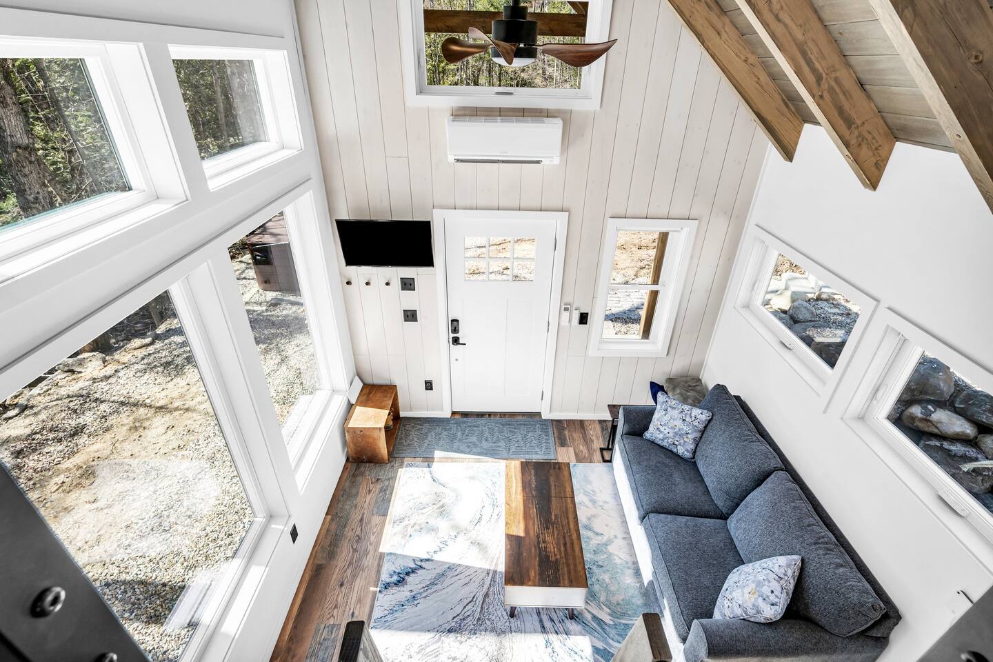 The space is perfectly designed to be small and cozy, but also have everything you need to both live and work comfortably. There is a loft with a queen-sized bed, as well as a pull-out couch in the living room area. *NOTE* This cabin was designed and built specifically for two people. There are two beds, so you are welcome to travel with four guests, but please note there is not a wall between the two beds (the loft is open to the living room), and the dining table only has two stools. *Tumbledown Mountain - 15 minutes *Mt. Blue State Park - 4 minutes *Farmington - 25 minutes *Rumford - 30 minutes *Sugarloaf Mountain - 1 hr *Saddleback Mountain - 45 minutes *Sunday River - 50 minutes KEY FEATURES: - hot tub - fully equipped kitchen - porch swing - large picture windows - fire pit - flat top Blackstone grill - outdoor twinkle lighting BEDROOM The loft area is accessed by a ladder that can be tucked away to create more space downstairs. On the night stand you will find a power station and sound machine. The queen bed sits below a skylight perfect for stargazing. BATHROOM The tiny home has just one full bathroom with all the conveniences of a full-size home. The locking pocket door provides privacy. Tile shower with glass door and shelves for your products. KITCHEN, DINING The small kitchen and 2-seater dining table offers all the conveniences of a full-size kitchen just shrunk down into a mini version to fit in the space perfectly. The kitchen will be fully stocked so you can cook all your own meals, and includes pots, pans, knives, utensils, and an array of different style coffee makers. The microwave-looking appliance is also an oven AND an air fryer. Some bad news…although the mini-fridge has a freezer it does NOT fit a pint of ice cream....plan your frozen desserts according! LIVING ROOM From the full-size couch, stream your favorite shows on the compact 32" HDTV. From this cozy spot, you feel like you are part of the forest that can be seen through the large picture windows. Floor-to-ceiling windows bring the stunning natural scenery indoors, fulfilling your longing to experience nature's beauty. OUTSIDE SPACE Step out onto the porch and hang out on the Amish build porch swing. Cook up all your favorite meals on the Blackstone flat top grill. Hop in the hot tub to rejuvenate your mind and body, you'll be surrounded by nature. Sit around the custom designed, welded fire pit while roasting marshmallows, reminiscing on old memories, and creating new ones. There is parking for 3 cars in the driveway. LOCATION While this area may feel like the middle of nowhere to most people, it is home to us. The tiny home is within 30 minutes of hospitals and groceries (Farmington & Rumford). And right in the middle of many outdoor activities. The location of the tiny home is right in historic downtown Weld. It sits just down the hill from the one road that passes through town and you may see and hear the few cars pass by while sitting around the fire.